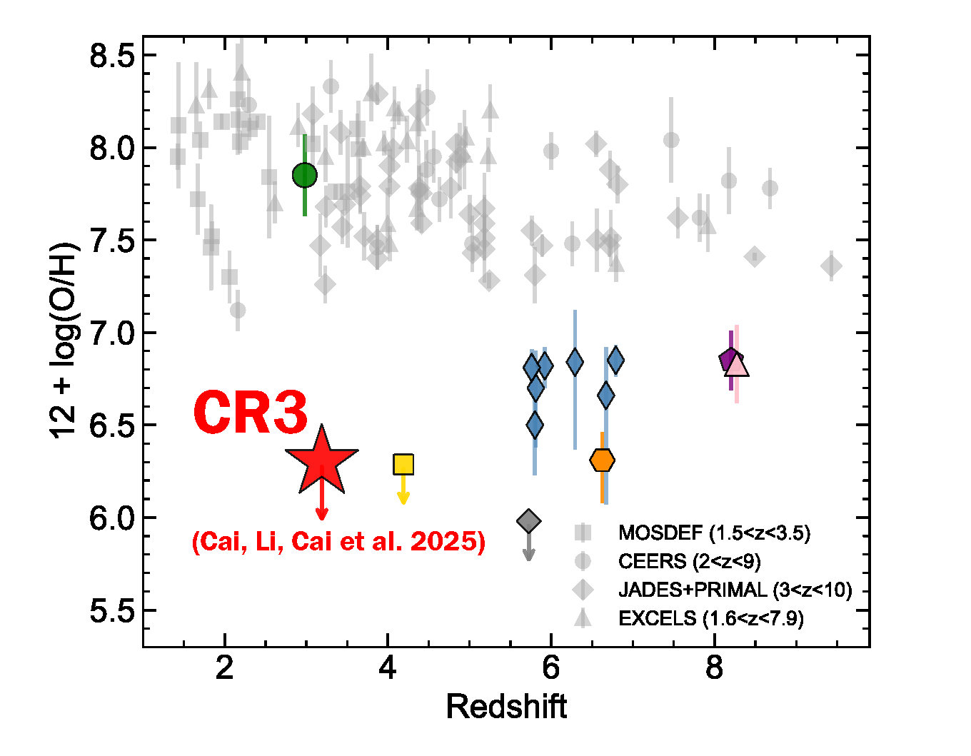 Introduction: An international collaboration led by the Department of Astronomy at Tsinghua University has discovered a galaxy extremely poor in metals, suspected to contain "first-generation" stars, by using combined observations from the James Webb Space Telescope (JWST), the Very Large Telescope (VLT), and the Subaru Telescope. The team has named this galaxy "CR3". It is located in the "cosmic noon" period, dating back to approximately 11.5 billion years ago. CR3 is currently the galaxy with the lowest abundance of heavy elements found at "cosmic noon", with an elemental content close to that theoretically predicted for "first-generation galaxies". This discovery is akin to finding a “living fossil” in the middle-aged Universe, suggesting that Population III star formation may have persisted longer than previously believed, and revealing the inhomogeneity and complexity of cosmic chemical enrichment. The results have been published in The Astrophysical Journal Letters (ApJL).
