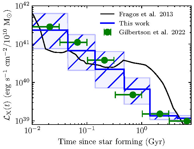 Figure 2: Ideal "Stable" vs. Realistical "Fading". A comparison of the luminosity evolution of X-ray binaries. Black Line (Theory): Traditional models predict a high-luminosity "plateau" lasting up to a billion years. Blue Line (This Work): The study reveals a continuous and rapid decline in brightness immediately after formation. The "missing plateau" explains why X-ray binaries at ~1 billion years old are observed to be much dimmer than predicted.