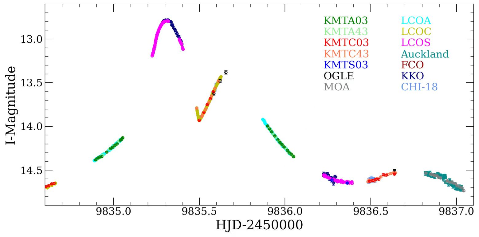 Caption: Peak light curve of the microlensing event KMT-2022-BLG-1818. The different colored points represent data from the various observing facilities indicated in the legend. The light curve exhibits three distinct bumps produced by the two orbiting planets. The first two peaks were primarily observed by the Las Cumbres Observatory network, in which Tsinghua University plays a major role.