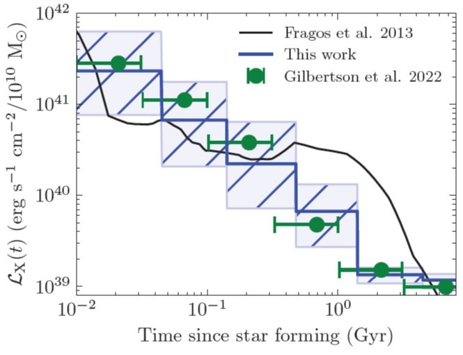 图2: 图中展示了 X 射线双星亮度随年龄演化的轨迹。与理论模型(黑色实线)预测的长达十亿年的高亮度“平台期”不同,本研究(蓝色实线及阴影)发现这些天体的亮度在形成后便持续下跌