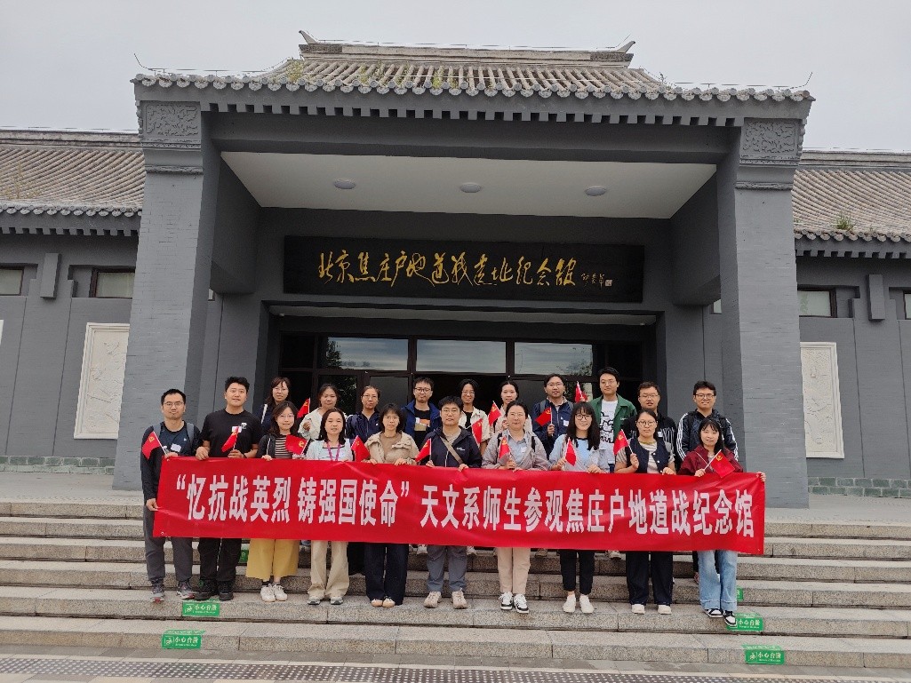 活动伊始,带队老师开展了“抗战精神 珍爱和平”的主题现场教学,从不同角度展现了海淀区从革命岁月到建设时期的奋斗历程和精神传承。通过合唱红色歌曲,使大家重温党的光辉历程和峥嵘岁月,深刻感悟红色基因,进一步坚定党员的共产主义理想和中国特色社会主义信念。在焦庄户地道战遗址纪念馆,党员及师生群众现场参观展厅历史文物和复原场景,重温了烽火岁月中军民团结抗战的英勇事迹。通过亲身体验狭窄曲折的地道遗址,让大家深刻感受到革命先辈的智慧与坚韧,使党员对“人民战争”的抗战精神的内涵有了真切体会。当日下午,支部成员及群众师生们相互交流参观感悟,探讨科研工作,将抗战时期不畏艰难、协作攻坚的精神与当今天文领域探索宇宙的使命相联系,强调跨学科合作与科技创新的重要性。